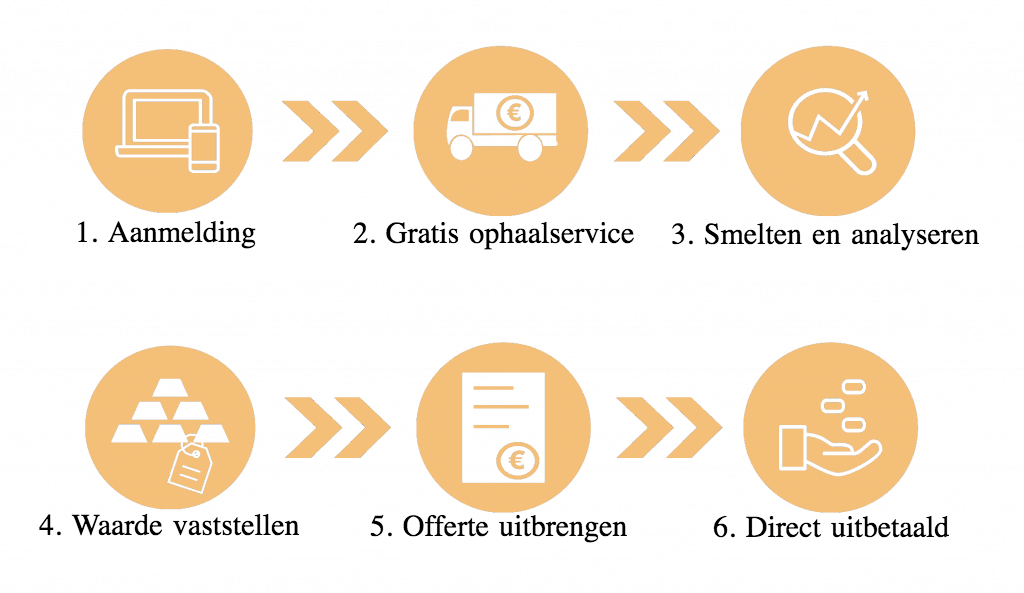 Wij hebben een speciaal stappenplan wanneer u uw goud verkoopt bij ons. Door middel van de onderstaande infographic kunt u eenvoudig bekijken hoe het verkopen van uw goud in zijn werk gaat: